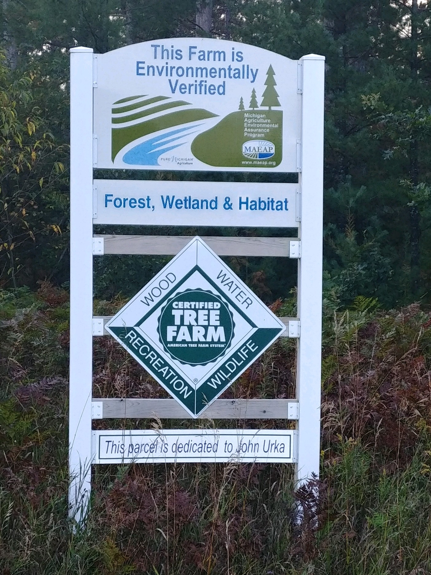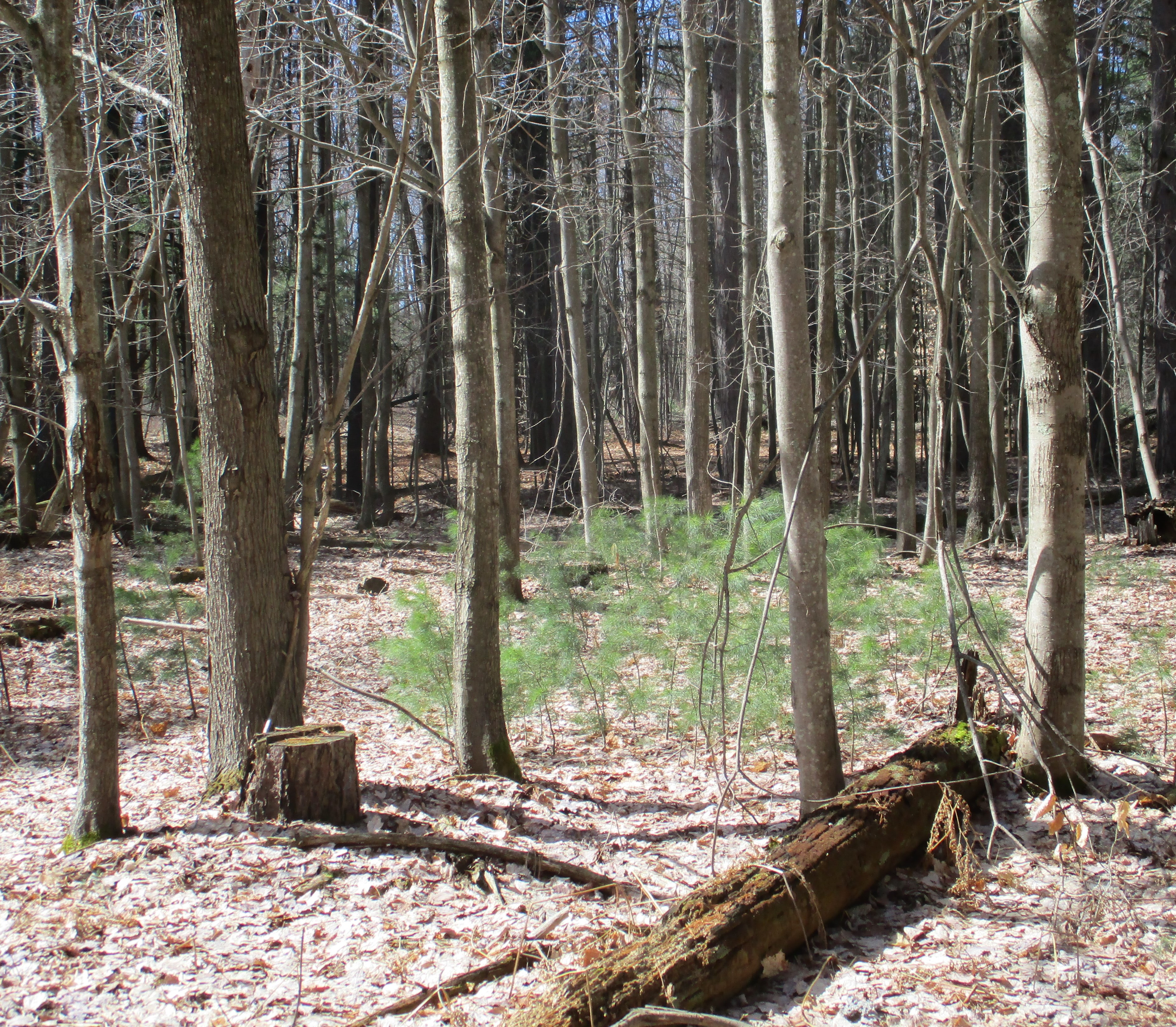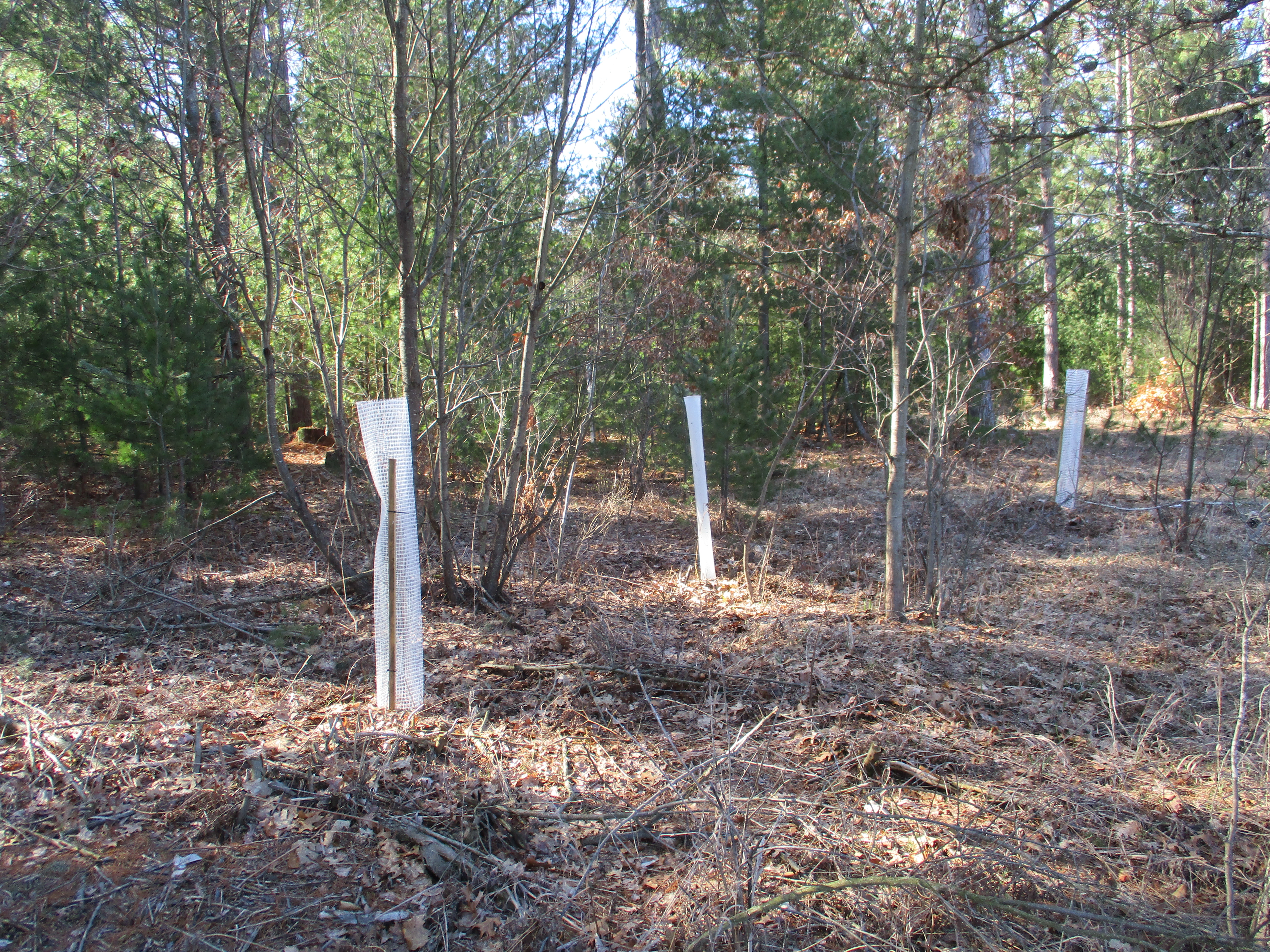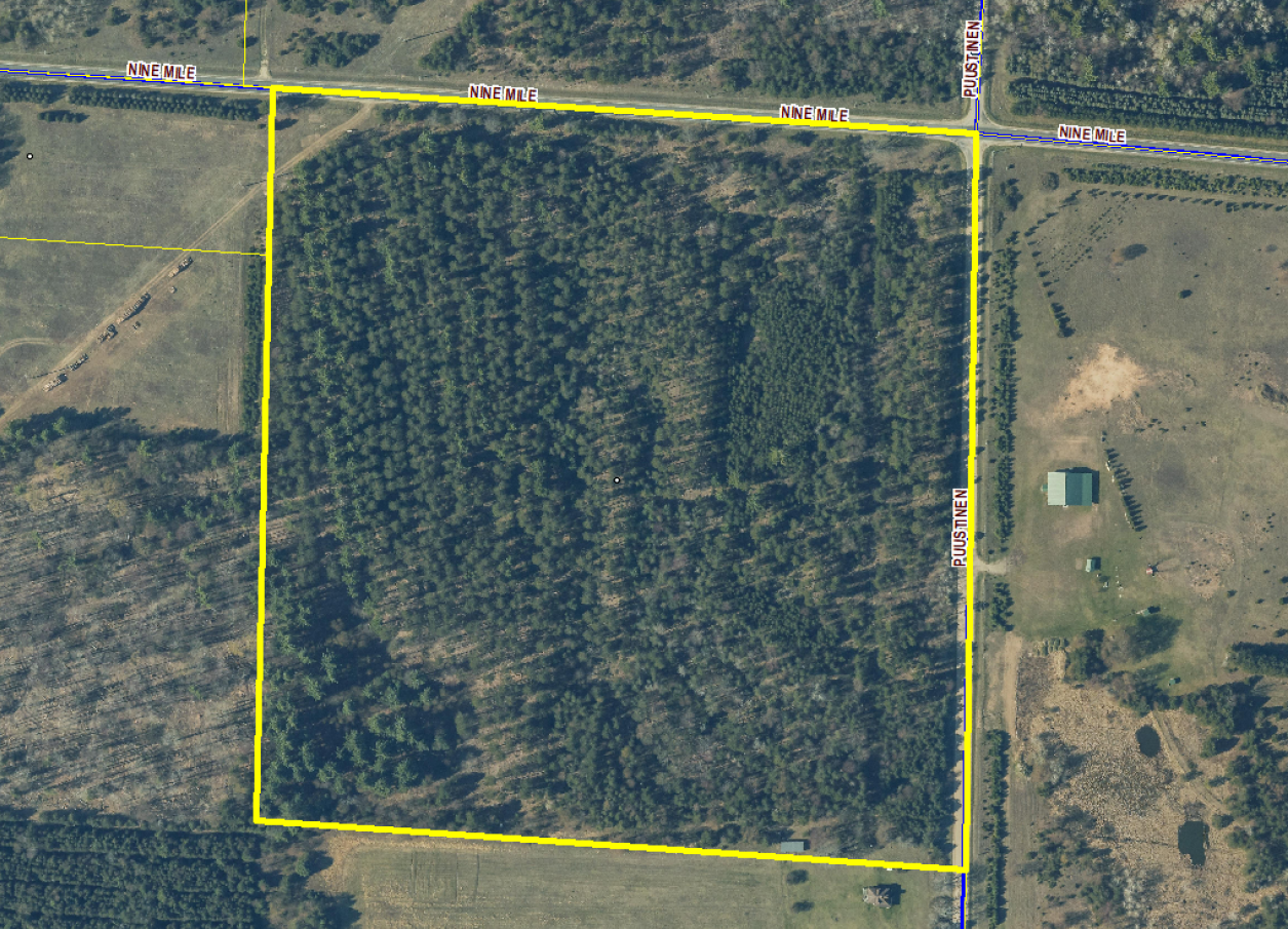 The Manistee Conservation District’s 40-acre parcel is in the NE ¼ of the NE ¼ of Section 27, T23N R14W (Maple Grove Township), Manistee County, Michigan. The entrance to the 40-acre parcel is located at Latitude/Longitude 44.3690, -85.9850.Most of the parcel is dominated by a historic red pine plantation, with inclusions of jack pine, Scots pine, white pine, and deciduous trees such as black cherry and oak. The southwestern corner of the parcel is characterized by mixed deciduous and coniferous forest. The northwest corner of the parcel is characterized by non-forested habitats, including an area that has previously been used as a landing area for timber harvesting. The northern edge of the parcel (adjacent to 9 Mile Road) is characterized by a mixture of non-forested habitats and patches of young deciduous and coniferous forest.